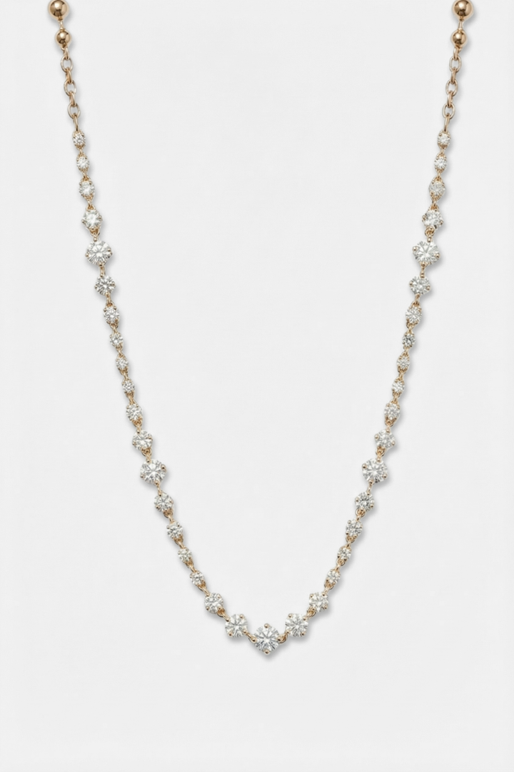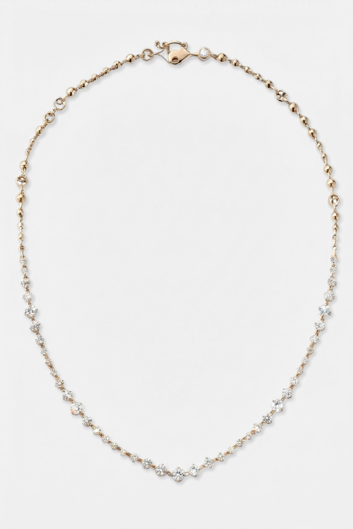 The Mirage Necklace plays with light and reflection, creating a soft illusion of movement. Delicate yet captivating, it adds depth without excess.