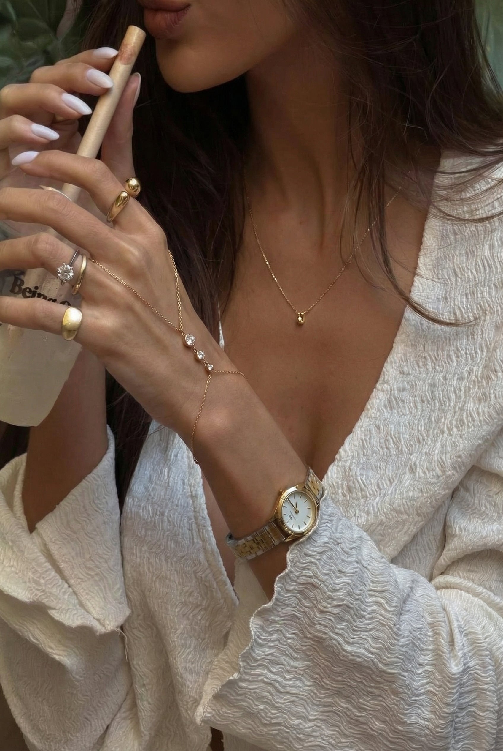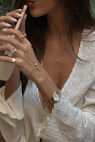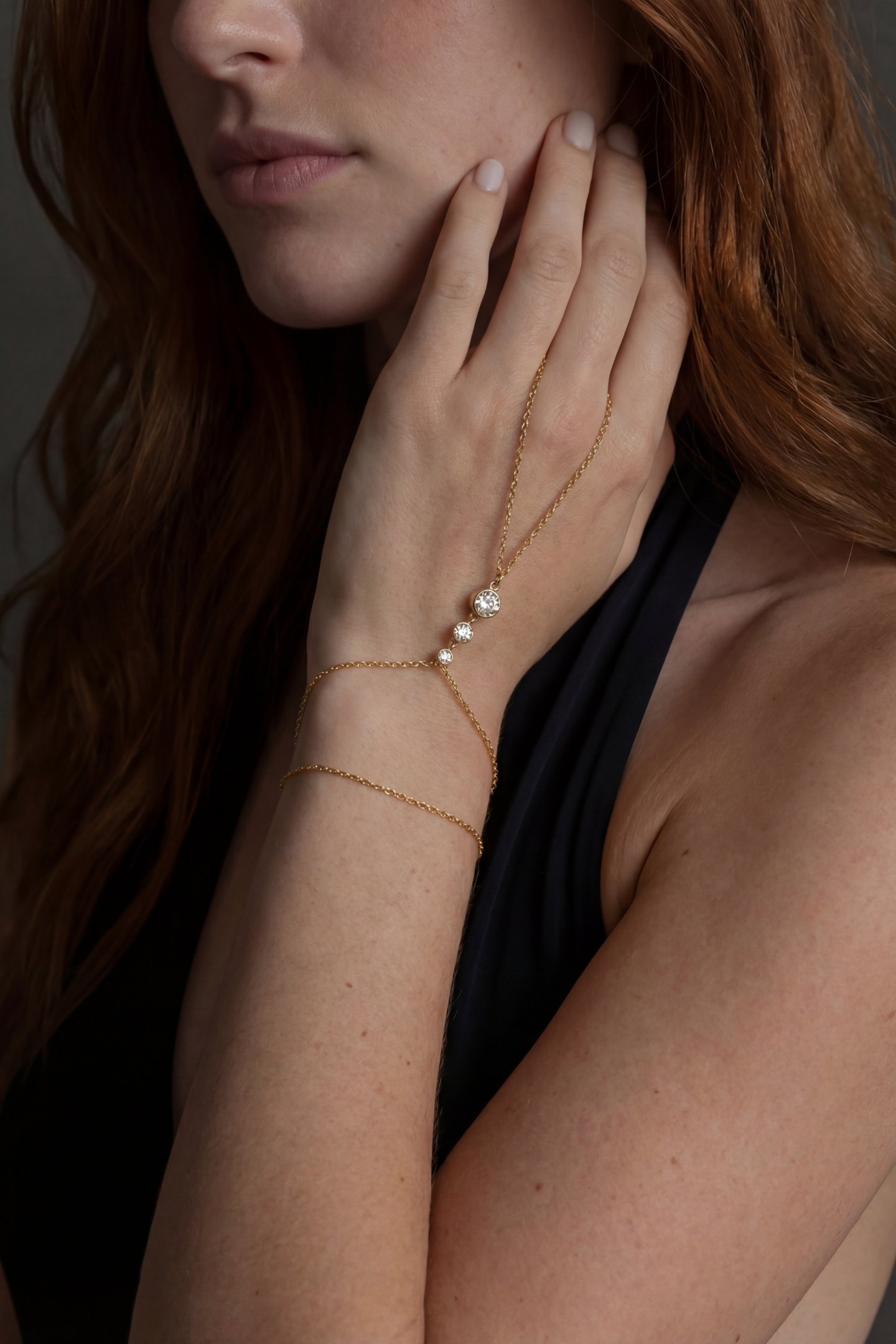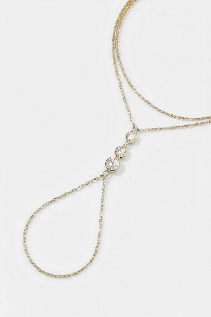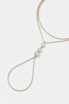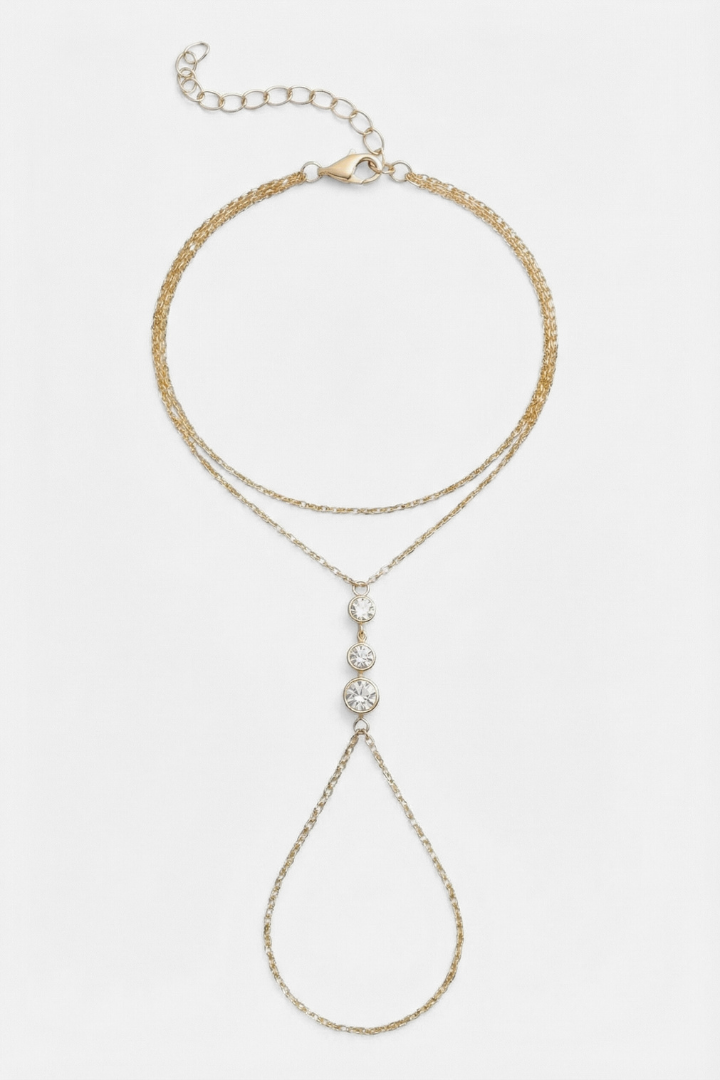 The Solara Hand Chain is our modern take: a clean gold chain that moves from wrist to finger, catching light like a small sun.