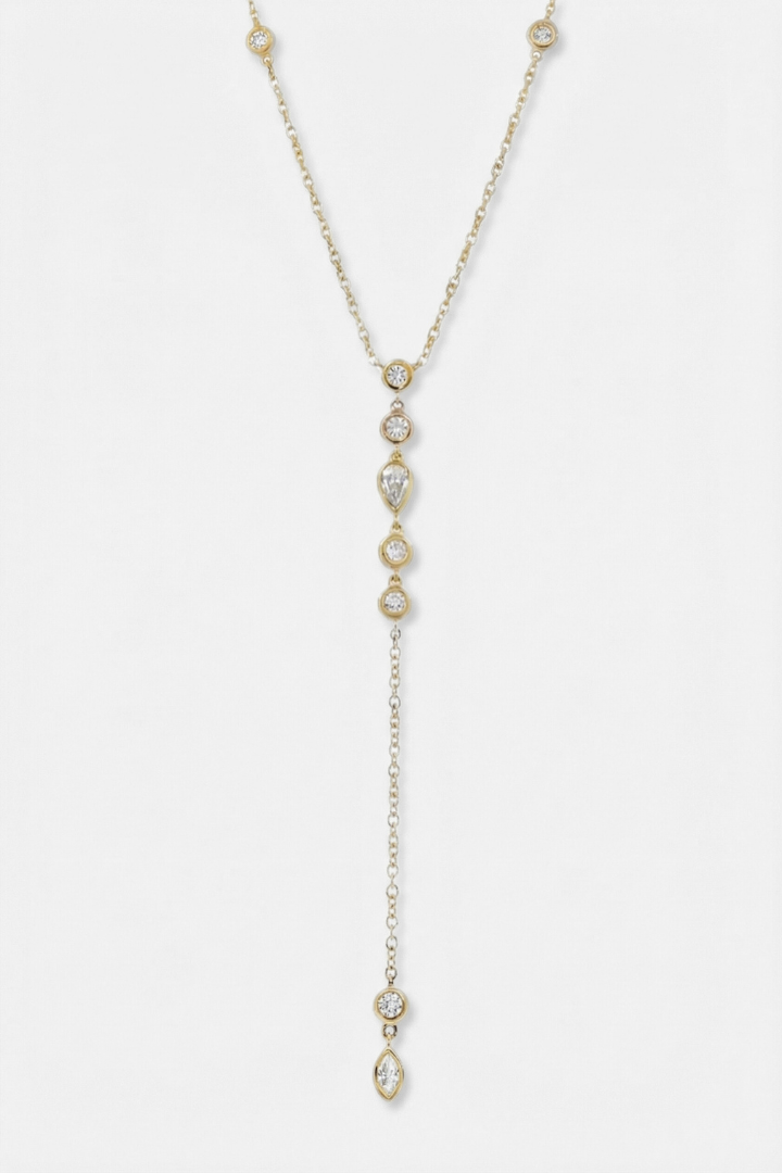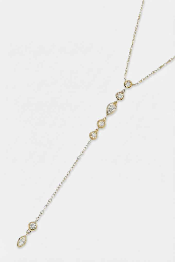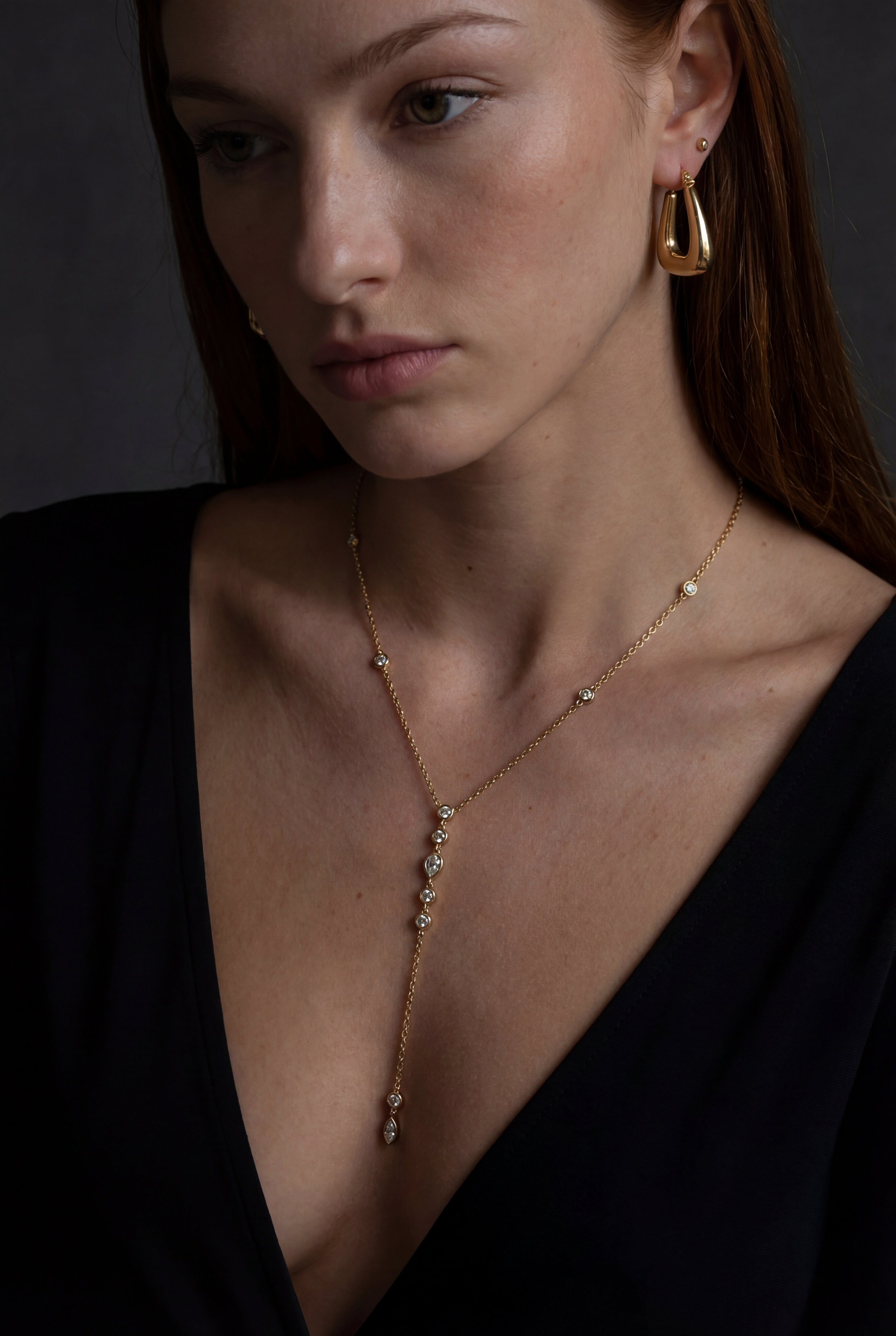 The Empress Lariat falls with fluid elegance, creating a long, sculptural line along the neckline. Refined yet commanding, it brings a sense of quiet power to any look.